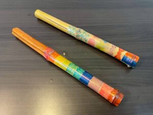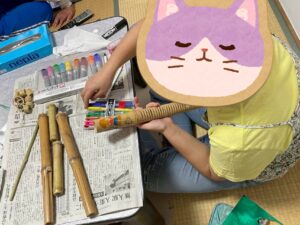 午後からは創作で明日、わくわくの郷でするクラフトの竹を使った楽器づくりをしました。切りっぱなしの角張った竹をやすりがけして、イラストを描いたり色を塗ったりしました。それ以外にもDVDを観たり、タブレットで検索したり思い思いの活動に取り組んでいました。